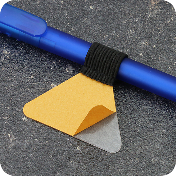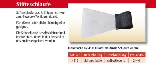 Stifteschlaufe aus kräftigem Gewebe-/Textilgummiband. Für dünne und dicke Schreibgeräte geeignet. Die Stifteschlaufe ist selbstklebend und kann einfach hinten in den Einband eines Buches eingeklebt werden.